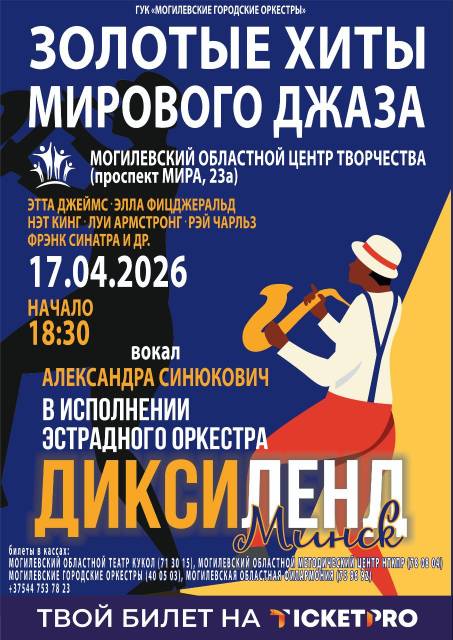 Государственное учреждение культуры «Могилевские городские оркестры» представляет! Закройте глаза, откиньтесь в кресле и позвольте живым джазовым хитам унести вас прочь от суеты и забот. Музыка Эллы Фицджеральд, Луи Армстронга, Этты Джеймс и других легенд подарит тепло и вдохновение. Это не просто шоу — это момент, когда душа поёт, а сердце танцует! Не важно, эксперт ли вы в джазе, главное — настроиться на волну радости, расслабления и легкости. Подарите себе вечер перезагрузки и хорошего настроения! Дата/Время — 17.04.2026, 18:30. Место проведения — Концертный зал Могилевского областного центра творчества, проспект Мира, 23а Цена — 30 BYN.