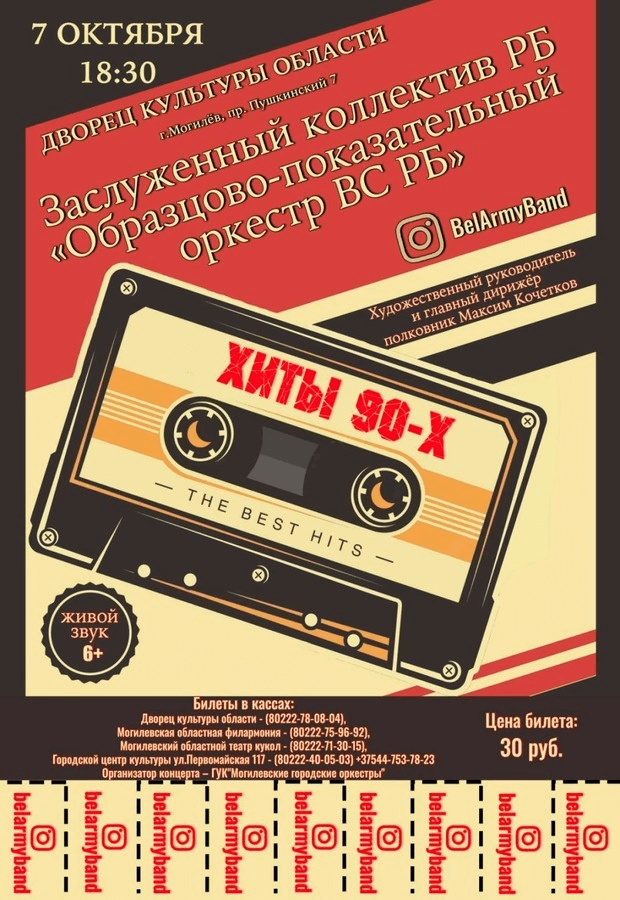 7 октября 2025 года в 18.30 состоится концерт Заслуженного коллектива Республики Беларусь «Образцово-показательный оркестр Вооруженных Сил Республики Беларусь» с новой программой «Хиты 90-х». Вас ждёт калейдоскоп из любимых песен и знакомых мелодий, которые помогут Вам погрузиться в атмосферу прошлых лет. Артисты с удовольствием споют хиты, которые навсегда поселились в наших сердцах. Вам обеспечено хорошее настроение и прекрасное времяпровождение. С нетерпением ждём встречи с Вами.